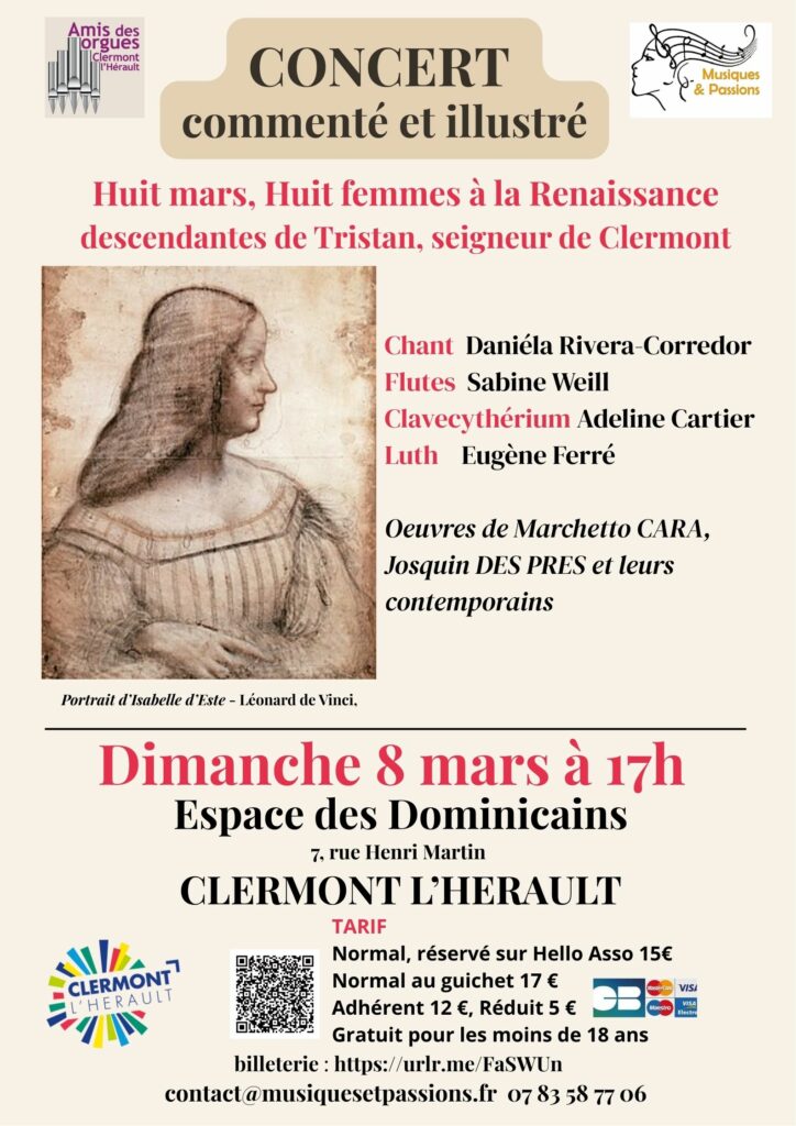 Fil conducteur du concert, l’histoire de ces femmes mécènes nous est contée par Brigitte Saint-Pierre. Le récit se mêle aux œuvres d’illustres compositeurs de la Renaissance, interprétées par des musiciens spécialistes de la musique de la Renaissance, passionnés par ce projet. Ceux-ci nous font partager leur passion, et rendent cette musique ancienne extrêmement vivante!